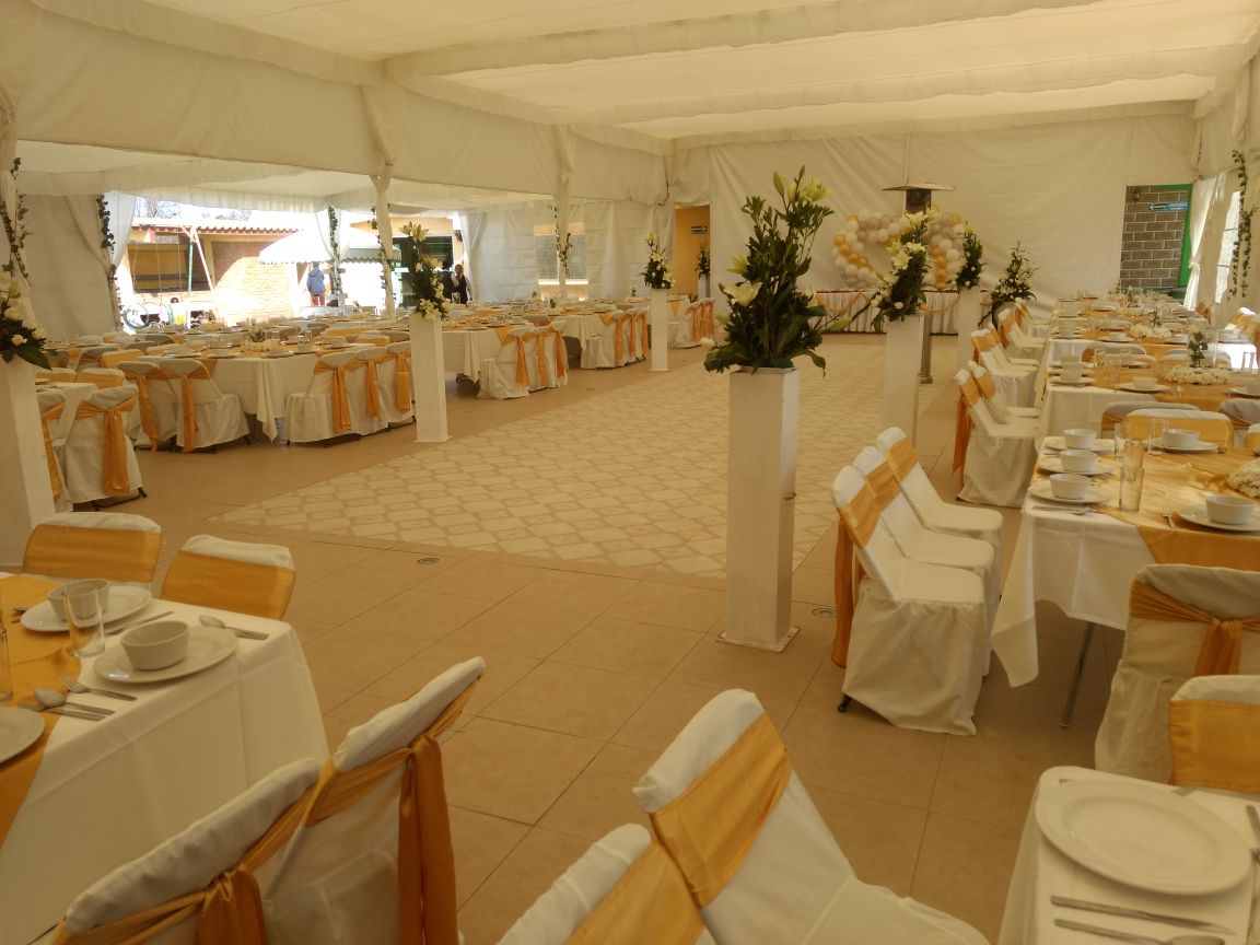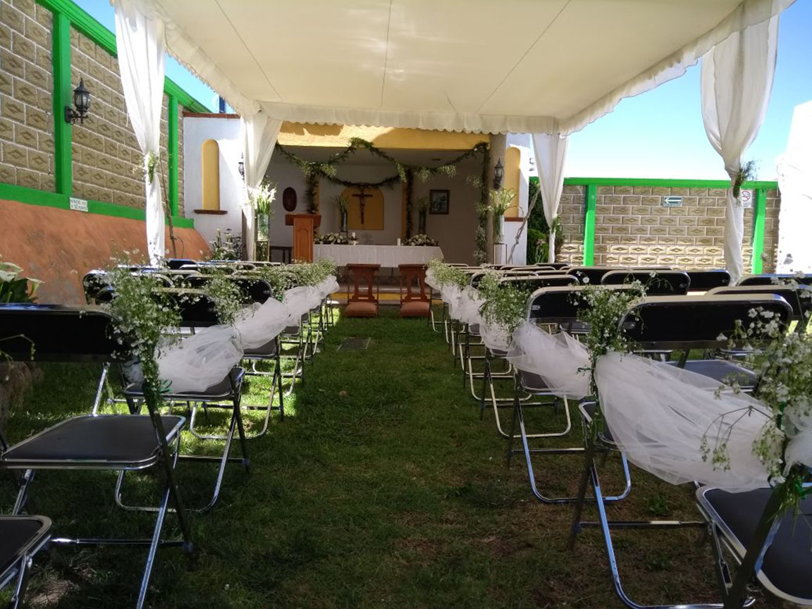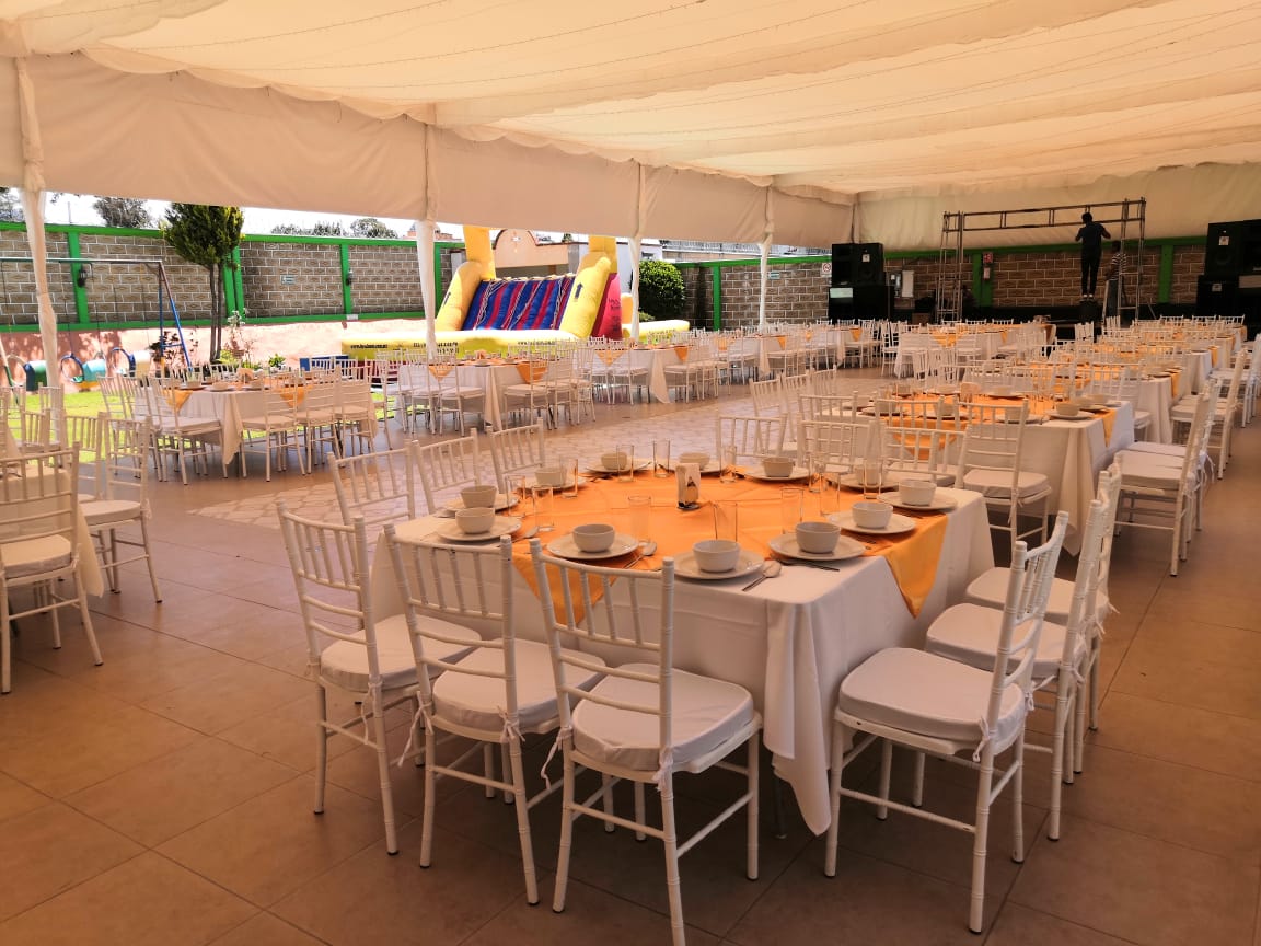 Salón Jardín $8,900.00 con mesas y sillas para 150 personas.